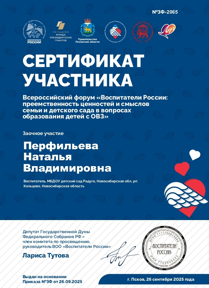 сертификат участника Всероссийский форум "Виспитатели России:преемственность ценностейи смыслов семьи и детского сада в вопросах образования детей с ОВЗ"