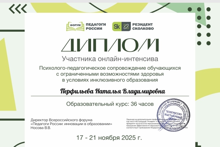 Диплом участника онлайн-энтенсива психолого-педагогического сопровождения обучающихся с ограниченностью, возможностью здоровья в условиях инклюзивного образования.